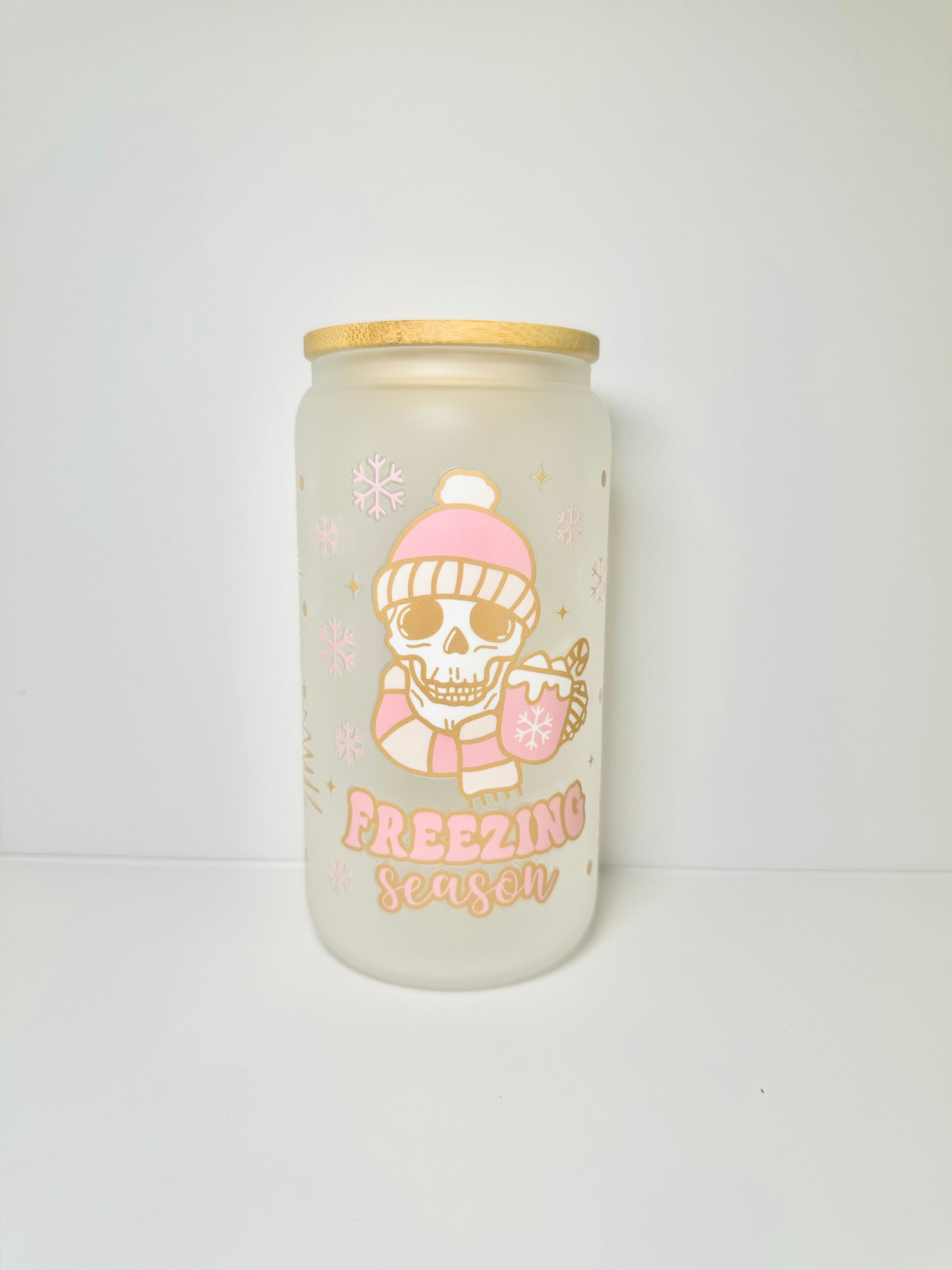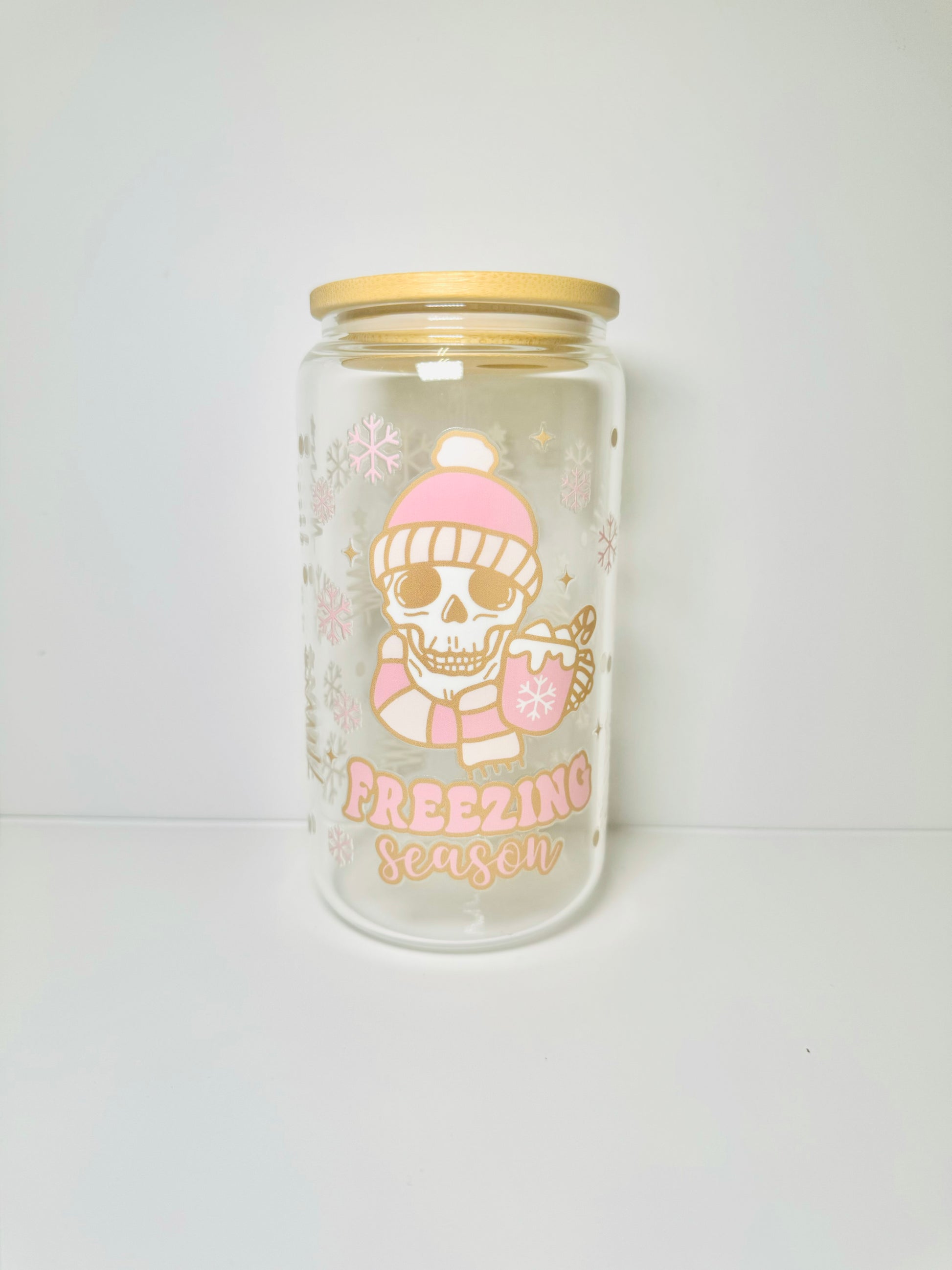 Freezing Season Christmas 16oz Glass Cup with Vibrant DTF Wrap