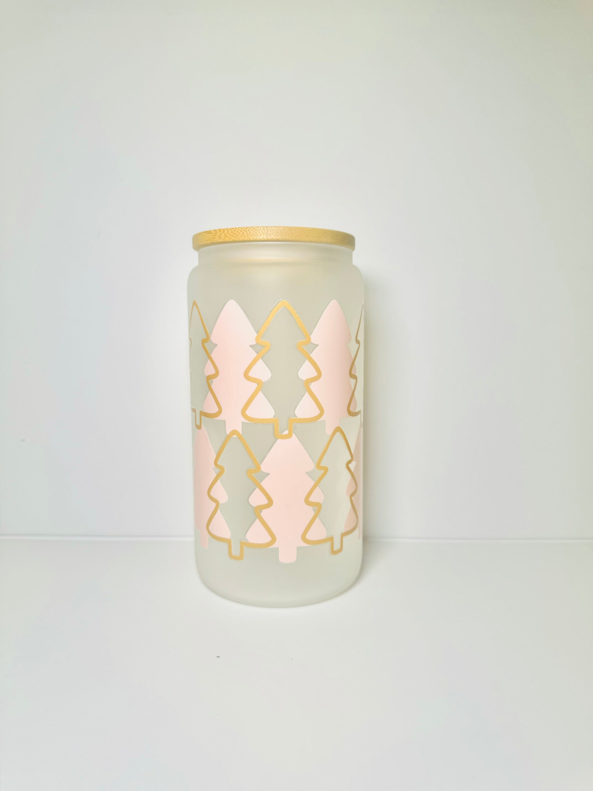 Pink Trees Christmas 16oz Glass Cup with Vibrant DTF Wrap